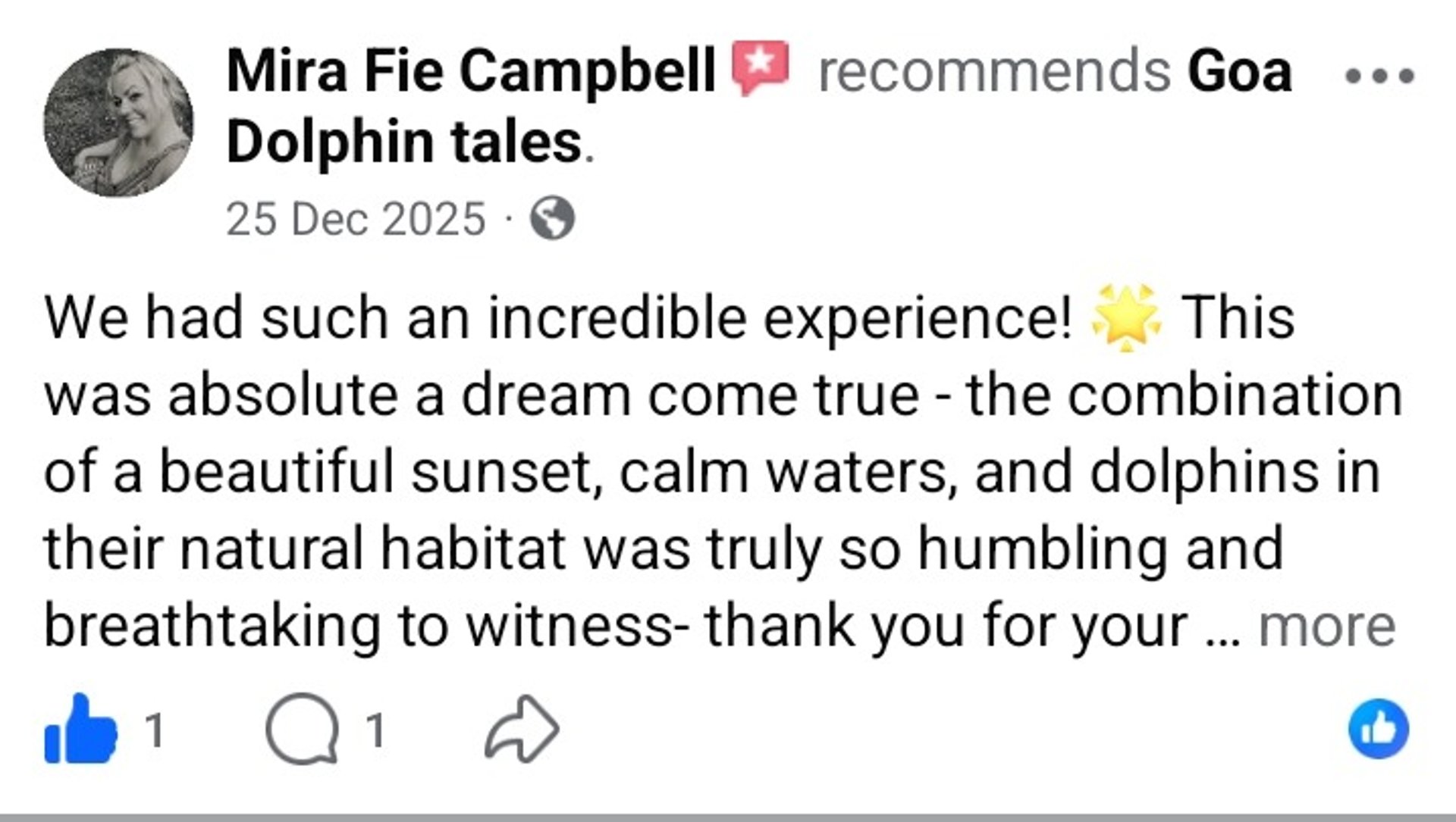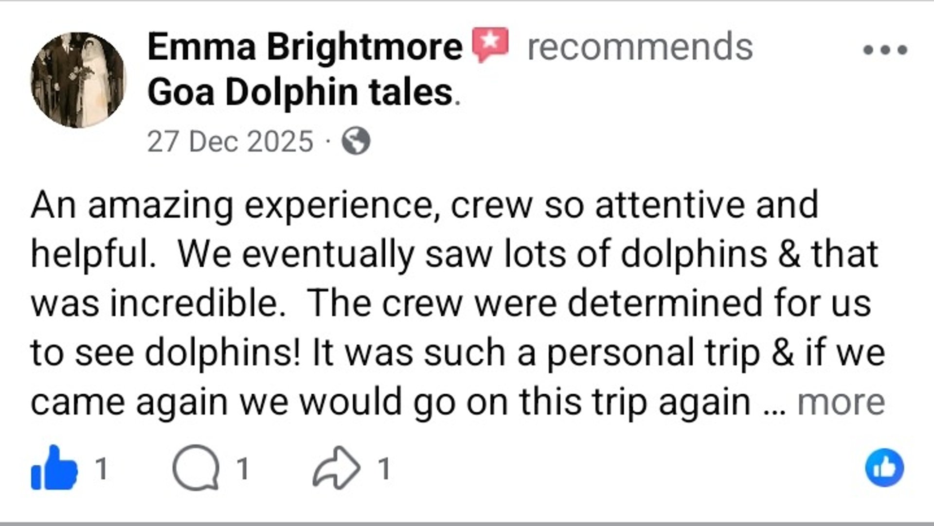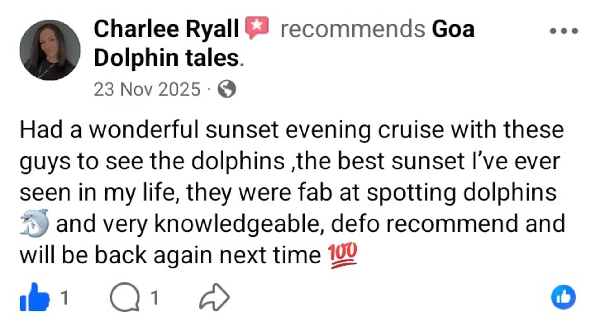 "If you're looking for a peaceful escape from the busy North Goa beaches, this is it. We booked a private boat with Goa Dolphin Tales and it was easily the highlight of our holiday. Being a family-run business, the communication was excellent and there was zero stress about 'tourist traps' or agents. We had the whole boat to ourselves for the sunset, and seeing the dolphins in their natural habitat without ten other boats around was truly humbling. The captain even pointed out the 17th-century Portuguese forts with great local insight. 10/10 for safety and service!"