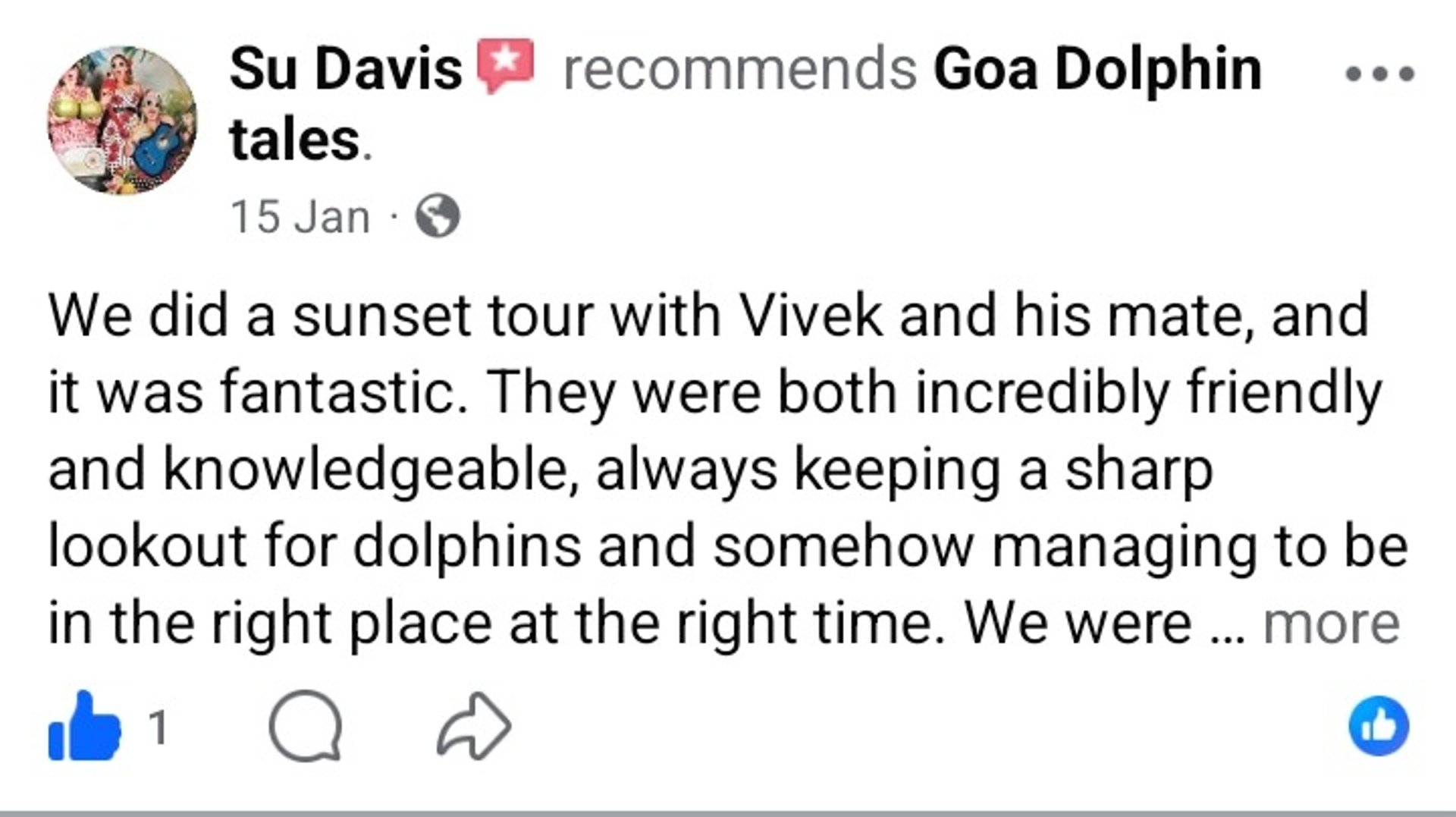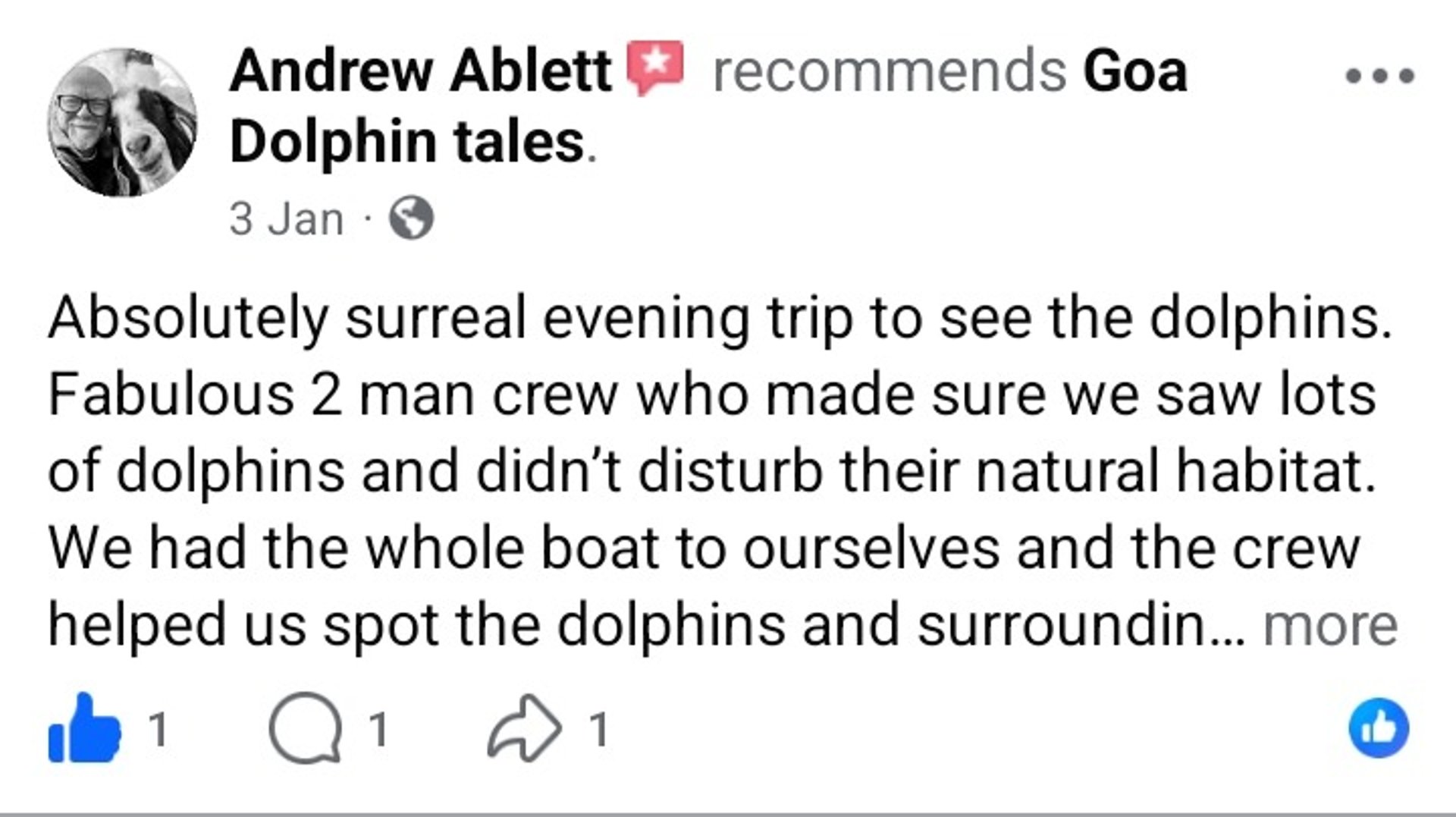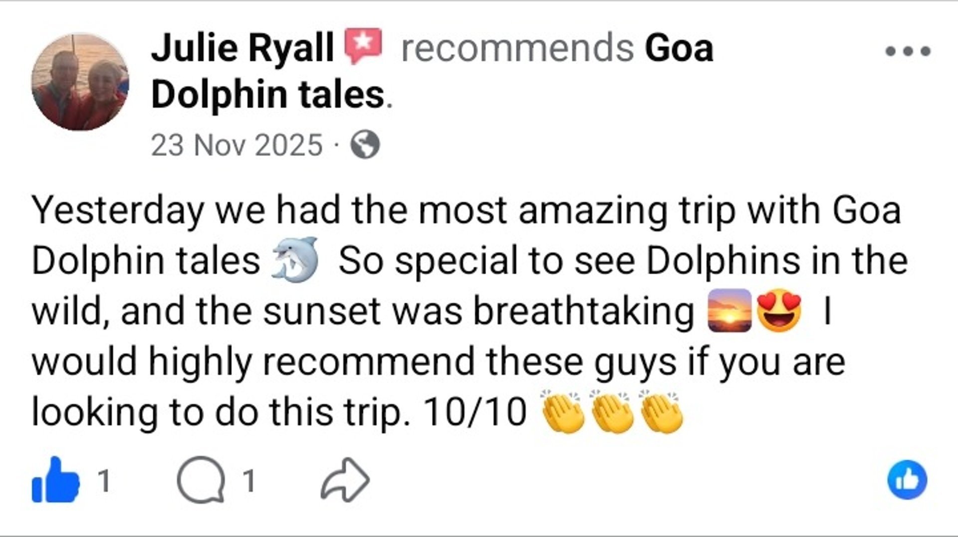 "If you're looking for a peaceful escape from the busy North Goa beaches, this is it. We booked a private boat with Goa Dolphin Tales and it was easily the highlight of our holiday. Being a family-run business, the communication was excellent and there was zero stress about 'tourist traps' or agents. We had the whole boat to ourselves for the sunset, and seeing the dolphins in their natural habitat without ten other boats around was truly humbling. The captain even pointed out the 17th-century Portuguese forts with great local insight. 10/10 for safety and service!"